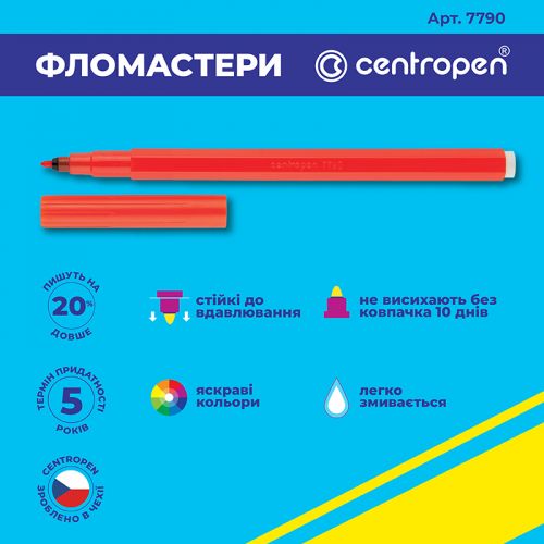Фломастери з чорнилом, що легко відпирається, на водній основі. Яскраві й насичені кольори. Легко змивається з рук і відпирається з одягу. Чорнило безпечне для здоров’я. Круглий пишучий вузол. Ширина сліду 1-2 мм. Пишучий вузол витримує велике навантаження без деформації. Вентильований ковпачок. Не висихає без ковпачка протягом 10 днів. Корпус з поліпропілену. Упаковка пластиковий пенал. Термін зберігання – 5 років.