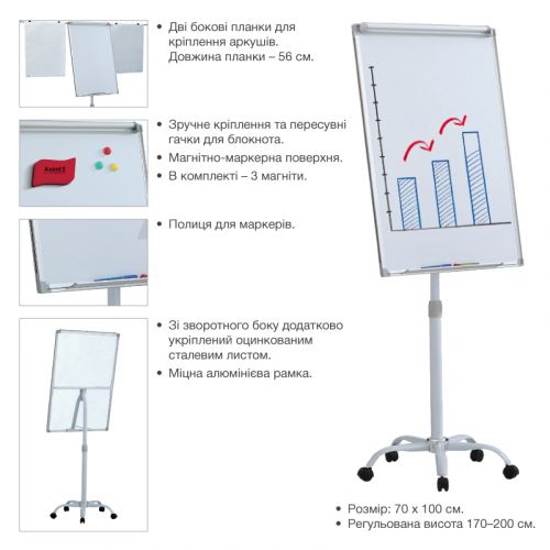 Мобільний магнітно-маркерний фліпчарт Axent 9707-A. Зі зворотнього боку фліпчарт додатково укріплений оцинкованим сталевим листом. Регульована висота 170–200 см. Зручне притискаюче кріплення, регульовані гачки для блокноту. В комплекті – полиця для маркерів, 3 магніти. Індивідуальна упаковка.