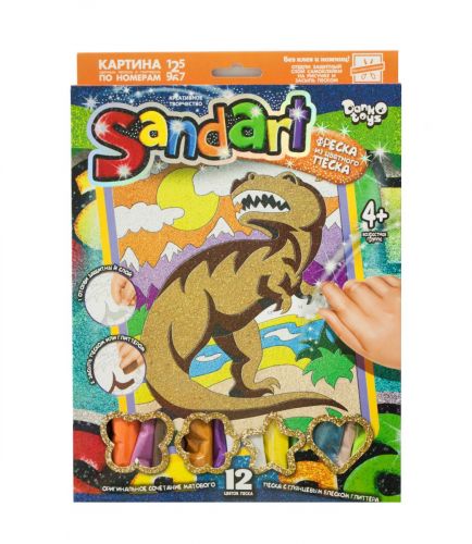 Набір для творчості “Sandart” фреска з кольорового піску. Розвиває креативне мислення, творчі здібності, художній смак. Без ножиць і клею. Інструкція: 1) Відокремте з ділянок, позначених одним певним номером, висічену захисну плівку; 2) Засипте на відкриту липку поверхню пісок обраного кольору. Ви можете прикрасити картину гліттернимі блискітками, замінивши будь-який колір піску на глиттер, на свій розсуд.