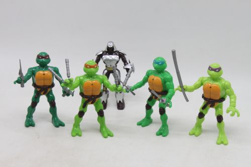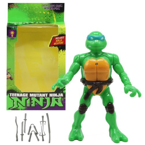 Пластикова фігурка у вигляді персонажа легендарного мультфільму “Черепашки ніндзя”. Детальна, схожа на свого мультяшного прототипа. У героя рухливі руки. На спині кнопка, яка включає лампочку на грудях. Розмір фігурки – 12,5 х 8,5 см. У наборі комплект зброї всіх 4 черепашок.
