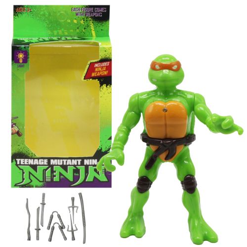 Пластикова фігурка у вигляді персонажа легендарного мультфільму “Черепашки ніндзя”. Детальна, схожа на свого мультяшного прототипа. У героя рухливі руки. На спині кнопка, яка включає лампочку на грудях. Розмір фігурки – 12,5 х 8,5 см. У наборі комплект зброї всіх 4 черепашок.