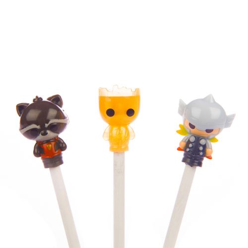 Колекційна фігурка-топпер для олівця чи ручки у вигляді героя фільмів та коміксів Марвел. У комплекті одна фігурка-сюрприз, яка трапляється випадковим чином. Загалом у серії є 18 унікальних фігурок, може трапитись фігурка з ароматом або золотистим покриттям.