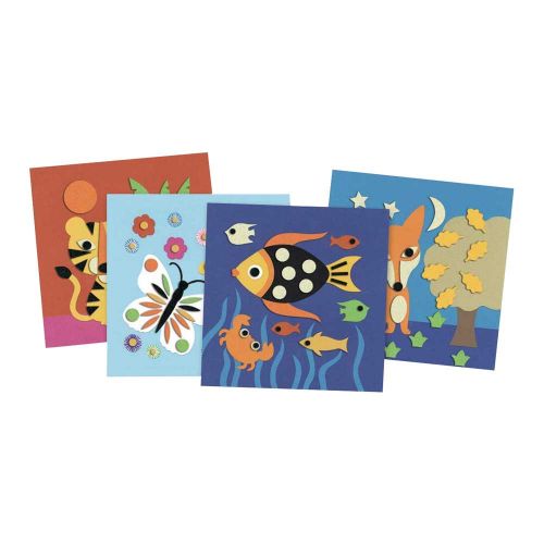 Набір з творчості для самих маленьких. Дитина прикрашає барвистими елементами пейзаж, характерний для тварини на картині. У комплект входять 4 барвисті ілюстрації, 144 фігурних елементів з фетру, які можна використовувати багаторазово, покрокова інструкція до іллюстаціям.