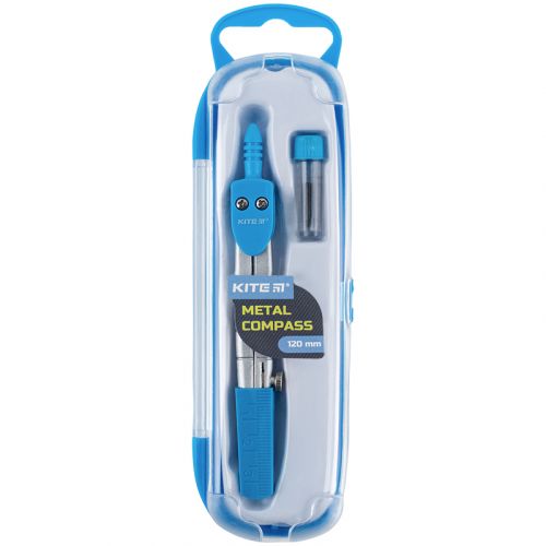 Металевий циркуль Kite K18-383-07 складається з металевого циркуля і пенала із запасним грифелем. Виріб призначений для креслення кіл і дуг кіл, також може бути використано для вимірювання відстаней, зокрема, на картах. Також, використовується в геометрії, кресленні, для навігації або створення правильного геометричного малюнка. Кріплення рухомої частини циркуля виконані фіксуючими болтами. Гостра сторона циркуля захищена ковпачком. Циркуль представлений в пластиковому футлярі, всі пластикові деталі набору пофарбовані в блакитний колір. Ніжки циркуля виконані в кольорі сірий металік. Довжина виробу 120 мм.