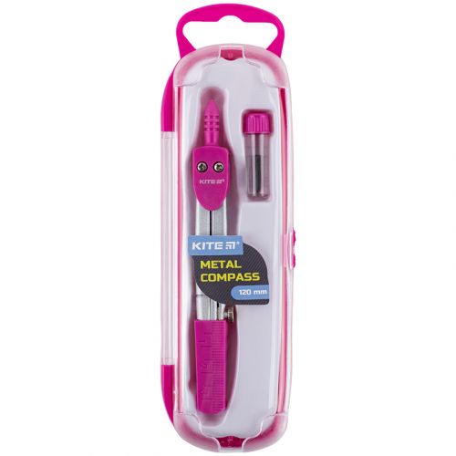 Металевий циркуль Kite K18-383-10 складається з металевого циркуля і пенала із запасним грифелем. Виріб призначений для креслення кіл і дуг кіл, також може бути використано для вимірювання відстаней, зокрема, на картах. Також, використовується в геометрії, кресленні, для навігації або створення правильного геометричного малюнка. Кріплення рухомої частини циркуля виконані фіксуючими болтами. Гостра сторона циркуля захищена ковпачком. Циркуль представлений в пластиковому футлярі, всі пластикові деталі набору пофарбовані в рожевий колір. Ніжки циркуля виконані в кольорі сірий металік. Довжина виробу 120 мм.