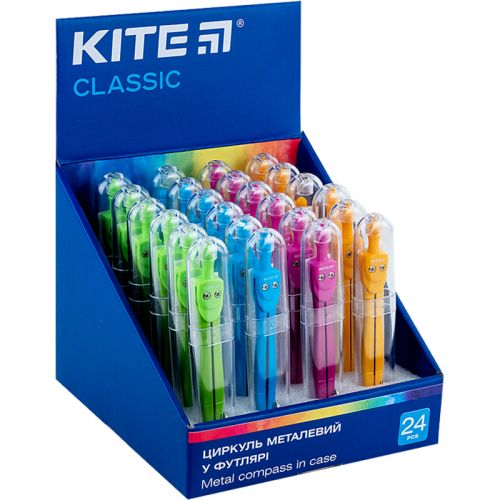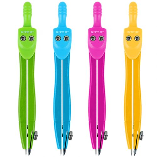 Металевий циркуль Kite Classic K-380 представлений в пластиковому прозорому футлярі, де він нерухомо фіксується. Виріб призначений для креслення кіл і дуг кіл, також може бути використано для вимірювання відстаней, зокрема, на картах. Також, використовується в геометрії, кресленні, для навігації або створення правильного геометричного малюнка. Кріплення рухомої частини циркуля виконані фіксуючими болтами. Ніжки циркуля і пластикові деталі пофарбовані в яскраві кольори. В асортименті представлені рожевий, блакитний, салатовий і жовто-гарячий кольори. Довжина виробу 115 мм.