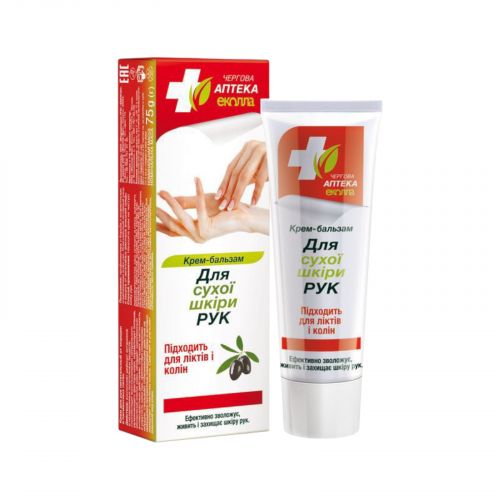 Крем-бальзам для сухої шкіри рук із серії “Чергова Аптека Еколла” ефективно зволожує й живить цілющими речовинами впродовж тривалого часу. Усуває лущення й сухість шкіри. Добре захищає шкіру рук від агресивних чинників зовнішнього середовища. Сприяє оновленню й відновленню шкіри після контакту з мийними засобами. Забезпечує еластичність, гладкість і привабливий (здоровий) зовнішній вигляд шкіри рук. Показання: суха та дуже суха шкіра рук, чутлива, схильна до почервоніння, лущення, підвладна контакту з агресивними мийними засобами та чинниками зовнішнього середовища. Профілактика вікових змін шкіри рук.