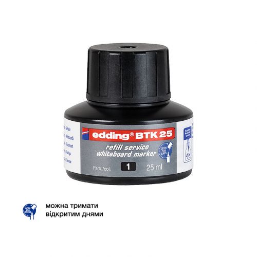Для заправки маркерів для сухостираємих дошок (е-360). На спиртовій основі, без додавання бутилацетата. Після заправки маркер не висихає без ковпачка 14 днів. Флакон з дозатором, об’єм 25 мл. Застосування: встановити маркер наконечником у флакон з чорнилом – і через деякий час (до 1 години) маркер готовий до застосування.