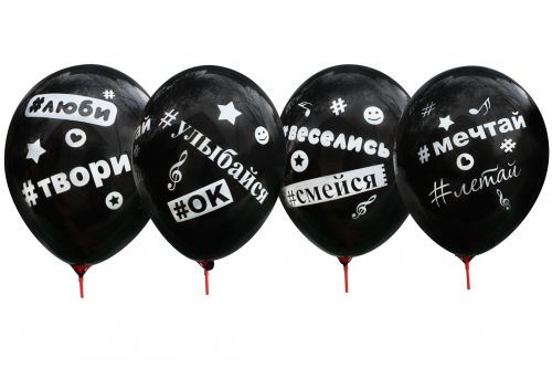 Набір пастельних чорних латексних кульок. Повітряні кульки прикрашені різними написами-хештег-побажаннями російською мовою. Діаметр – 12 “(30 см). 100 кульок в наборі.
