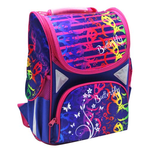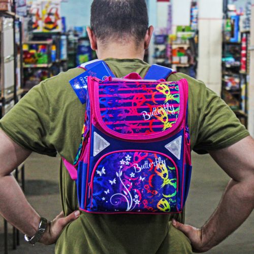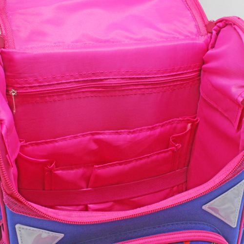 Дитячий рюкзак. Основні характеристики: ортопедична спинка; жорсткий каркас ранця; дві широкі м’які регульовані лямки; внутрішня сторона лямок та спинка з дихаючого матеріалу; ущільнена ручка для перенесення рюкзака; одне містке відділення на блискавці; всередині 1 роздільник та фіксуюча гумка; 2 додаткові кишені: передня кишеня на блискавці на та дві бічні сітчасті кишені; світловідбиваючі елементи на лямках та бічних кишенях. Розмір рюкзака – 33х15х26 см.