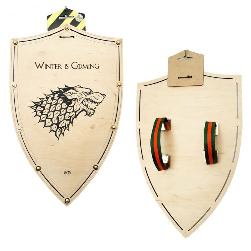 Модель щита з фанери (товщина 6 мм.). Лицьова сторона прикрашена зображенням; є декоративні елементи на корпусі; 2 ручки на зворотному боці щита. Розмір 47х30 см.