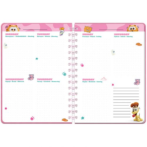 Щоденник-планер на спіралі. Тверда картонна обкладинка з фіксуючою резинкою. Ефект на обкладинці: софт тач та УФ лак. Всередині: • Розклад на тиждень; • Тиждень на двох сторінках, 5 різних дизайнів розворотів тижня; • 4 кольорові розворити в дизайн ліцензії; • 2 сторінки із стікерами; • Карман для зберігання дрібниць; Внутрішній блок : англійська, українська, польська, німецька. Формат А5, 138 стр., щільність аркушів 80г/м2.