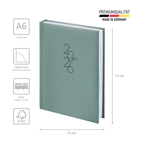 Щоденник датований кишеньковий Brunnen 2026 – компактна модель для активних особистостей. Гармонійне поєднання консервативного внутрішнього блоку та стильної обкладинки. Особливості: Компактний формат А6. Три мови: українська, англійська, німецька. Кремові форзаци. 1 сторінка – 1 день. Субота та неділя на одній сторінці. Організатор з 09:00 до 19:00. Інформаційний блок. Перфоровані датовані куточки. Якісний друк у сірому кольорі. Сторінки загального планування на місяць. Календарі на 2026 і 2027 рр. Білий папір 70 г/м². Відривні сторінки з перфорацією для записів. Обкладинка Linesse. Золоте тиснення.