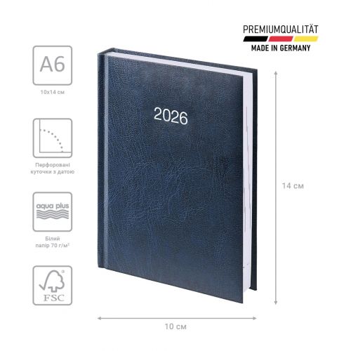 Щоденник датований кишеньковий Brunnen 2026 – компактна модель для активних особистостей. Гармонійне поєднання консервативного внутрішнього блоку та стильної обкладинки. Особливості: Компактний формат А6. Три мови: українська, англійська, німецька. Кремові форзаци. 1 сторінка – 1 день. Субота та неділя на одній сторінці. Організатор з 09:00 до 19:00. Інформаційний блок. Перфоровані датовані куточки. Якісний друк у сірому кольорі. Сторінки загального планування на місяць. Календарі на 2026 і 2027 рр. Білий папір 70 г/м². Відривні сторінки з перфорацією для записів. Обкладинка Miradur. Срібне тиснення.
