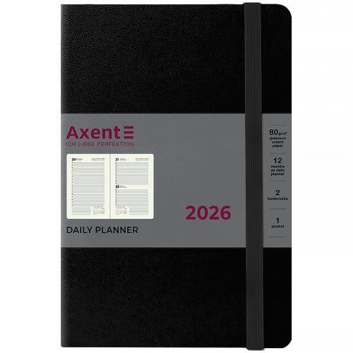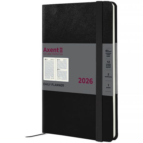 Зручний щоденник Axent із серії Partner Strong в твердій обкладинці. Використовується для щоденних записів, а також ділових та творчих задач. Тверда обкладинка допомагає зберегти акуратний та презентабельний вигляд протягом довгого часу. Якісний кремовий папір щільністю 80 г/м2 добре вбирає чорнило та забезпечує комфортне письмо. Зручно робити записи, креслити та малювати. Щоденник має датований блок у лінію на кожний день . Внутрішній блок українською мовою. Щоденник містить календар на 2026-2027 рік, загальний тижневий розклад, інформацію про свята, важливі номери телефонів, часові пояси країн світу, одиниці вимірювання, шкалу температур. Дві різнокольорові закладки-ляссе дозволяють швидко знайти та відкрити потрібні сторінки. Містить 168 аркушів, розмір – 145*210 мм. Петлі для ручки немає. Кишеня на форзаці.
