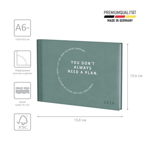Щотижневик 2026 кишеньковий Brunnen – стильний та компактний інструмент для планування. Особливості: Три мови: українська, англійська, німецька. Кишеньковий формат А6-. Дві сторінки – один тиждень. Інформаційний блок. Перфоровані датовані куточки. Якісний друк у сірому кольорі. Перфоровані сторінки у кінці. Алфавітна записна книга. Вишукані кремові форзаци. Кріплення по вертикалі. Сторінки загального планування на рік. Стильна обкладинка Torino Trend. Біле тиснення.
