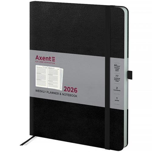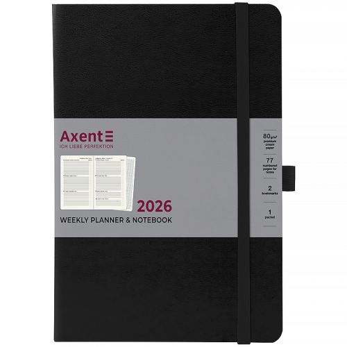 Щотижневик Axent формату А4- із серії Strong з твердою обкладинкою. Використовується для щоденних записів, а також ділових та творчих задач. Тверда обкладинка з вінілу допомагає зберегти акуратний та презентабельний вигляд протягом довгого часу. Якісний кремовий папір щільністю 80 г/м2 добре вбирає чорнило та забезпечує комфортне письмо. Зручно робити записи, креслити та малювати. Щотижневик поділений на 2 частини – датований блок у лінію для зручного планування справ і додаткові сторінки у клітинку для ведення особистих записів. Внутрішній блок українською мовою. Планер містить календар на 2026-2027 рік, загальний тижневий розклад, інформацію про свята, важливі номери телефонів, часові пояси країн світу, одиниці вимірювання, шкалу температур. Дві різнокольорові закладки-ляссе дозволяють швидко знайти та відкрити потрібні сторінки. Еластична тасьма запобігає самовільному відкриванню. Кишеня на форзаці. Містить 96 аркушів, розмір – 195*255 мм.