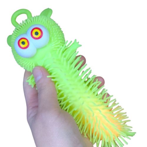 Кумедна світяшка-їжачок у вигляді гусенички з кумедними оченятами. Іграшка порожня всередині й наповнена повітрям по типу надувної кулі. Всередині іграшки також є пластикова світяшка, що активується при ударі об поверхню. Виконано з якісних та безпечних матеріалів. Для дітей старше 3-х років. Якщо іграшка трошки здута, можна накачати її за допомогою звичайного медичного шприца з голкою.