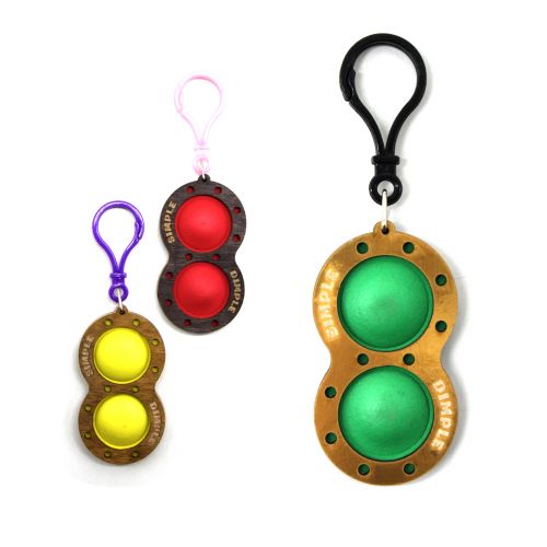Simple Dimple (або як часто пишуть Simpl Dimpl) дослівно перекладається з англійської як “проста ямочка”. Це силіконова іграшка з декількома опукло-увігнутими частинами. Ефект антистресу досягається шляхом багаторазового натискання на ці ямочки. Спочатку Симпл Дімпл був виключно дитячим розвагою. З його допомогою можна, наприклад, розвивати дрібну моторику рук. Але справжнім хітом, як і Pop It. стали тільки на початку 2021 року. Даний Симпл Дімпл виконаний у формі брелока, має 2 ямочки, а його основу виготовлено з дерева. Різні кольори в асортименті.