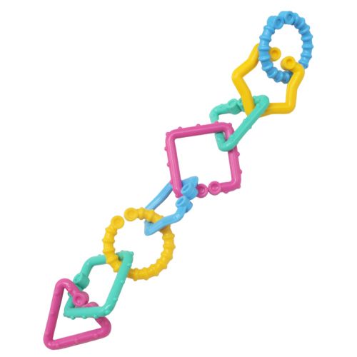 Іграшка міцна та абсолютно безпечна для малюка. В процесі гри розвивається зір, тактильні відчуття, спритність, координація рухів, дрібна моторика. Можна гратись кожним елементом окремо, або складати в ланцюжок і використовувати для підвішування іграшок на коляску чи ліжко. Довжина ланцюжка: 26 см.