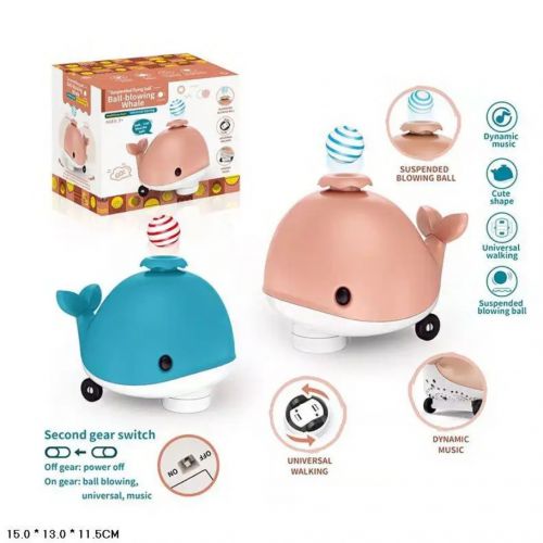 Оригінальна музична іграшка у вигляді кита, який може балансувати кульками повітря. При включенні кит починає випускати потік повітря з отвору на голові, завдяки чому створюється ілюзія того, що кулька “левітує”. Іграшка також оснащена звуковими ефектами (відтворює мелодії) та їздить у довільних напрямках. Працює від 3 батарей АА. Різні кольори в асортименті.