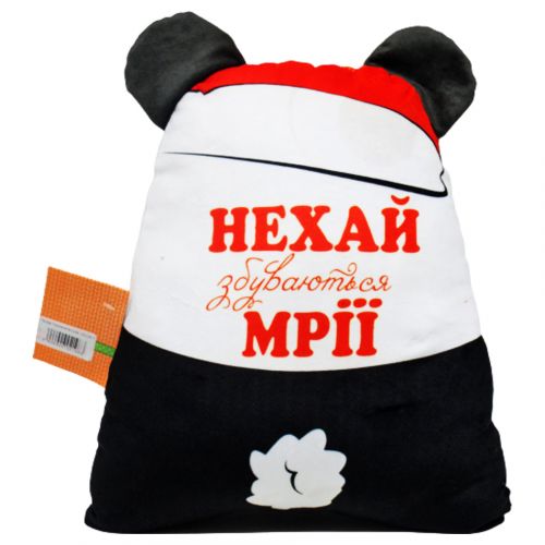 Мила іграшка-подушка у вигляді пандочки, яка тримає в руках чашку з напоєм. На звороті напис українською “Нехай збуваються мрії”. Дуже приємна на дотик. Виготовлена із якісних та безпечних матеріалів. Висота іграшки: 36 см.