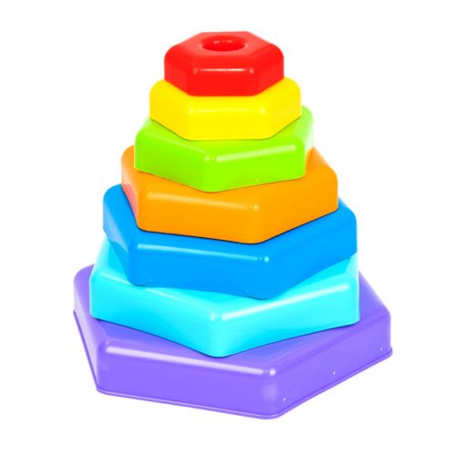 Іграшка “Райдужна пірамідка”. Складається з 7 елементів різного розміру і кольору, які накладаються один на одного. В ході гри дитина знайомиться з формами і розмірами предметів, вчиться просторово мислити, розпізнавати кольори, вивчає кількісний рахунок.