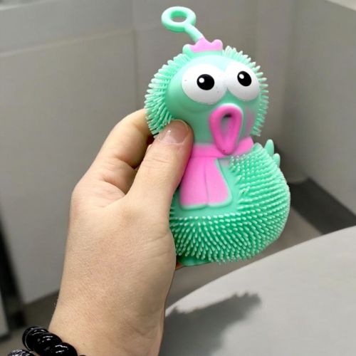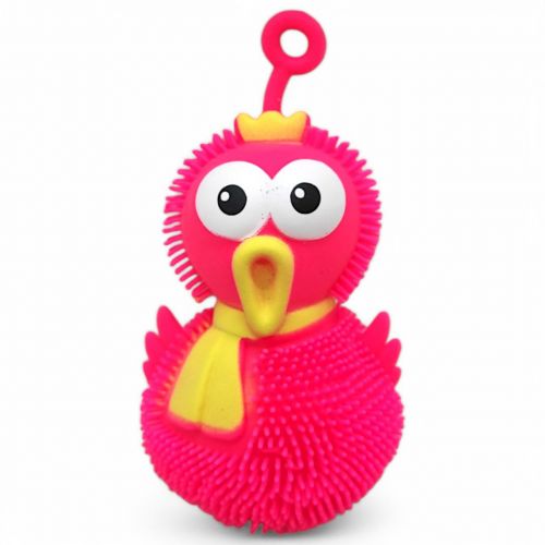 Кумедна світяшка у вигляді кошлатої курочки. Іграшка порожня всередині й наповнена повітрям по типу надувної кулі. Всередині іграшки також є пластикова світяшка, що активується при ударі об поверхню. Розмір курочки – 11х7х6 см. Виконано з якісних та безпечних матеріалів. Для дітей старше 3-х років. Якщо іграшка трошки здута, можна накачати її за допомогою звичайного медичного шприца з голкою (на іграшці є спеціальний отвір).