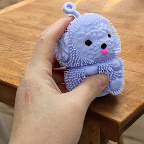 Кумедна світяшка у вигляді кошлатого песика. Іграшка порожня всередині й наповнена повітрям по типу надувної кулі. Всередині іграшки також є пластикова світяшка, що активується при ударі об поверхню. Розмір песика – 9х5,5х5,5 см. Виконано з якісних та безпечних матеріалів. Для дітей старше 3-х років. Якщо іграшка трошки здута, можна накачати її за допомогою звичайного медичного шприца з голкою (на іграшці є спеціальний отвір).