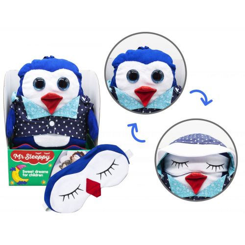Іграшка-сплюшка “Пінгвін”. Мила плюшева тваринка в смішному костюмі порадує вашого малюка. Іграшка приємна на дотик. З великими, яскравими очима, а під час сну, на іграшку можна одягати маску для сну (пришита до іграшки, її можна піднімати або опускати на очі). У наборі з сплюшей є маска для сну із зображенням мордочки тварини. Виконана з якісних і безпечних матеріалів.