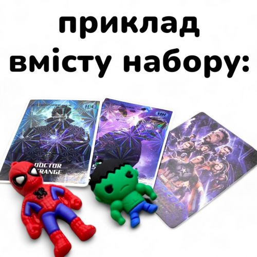 Набір-сюрприз для справжніх фанатів Marvel та DC! Усередині — гумова фігурка-брелок у вигляді одного з улюблених супергероїв та 3 яскраві колекційні картки. Ідеально підходить для подарунка, колекціонування або просто для веселощів. Кожен набір — це несподіванка, яка дарує радість відкриття та доповнює вашу колекцію.