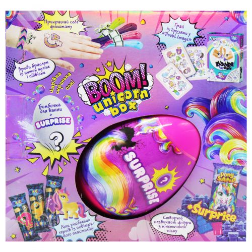 Іграшка-сюрприз “Boom! Unicorn Box” буде відмінним подарунком для дитини. У коробочці є безліч фантастичних сюрпризів, які зроблять дозвілля малюка цікавим і незабутнім. У наборі: пісок кінетичний “Magic Poni Sand” 150 м – 1 шт., повітряний пластилін в брикеті – 3 шт., нитки муліне – 4 шт., підвіска – 1 шт., настільна гра “Doobl image” – 1 шт. , лист з флештату 1 шт, яйце-сюрприз – 1 шт., інструкція – 1 шт.