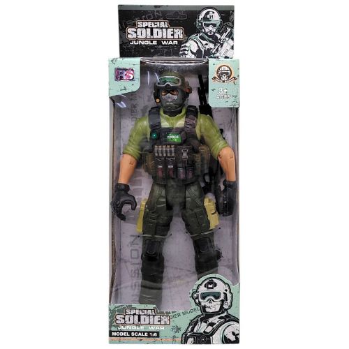 Ігрова фігурка у вигляді солдату серії “JUNGLE WAR”. Лялька має рухливі частини тіла, що дозволяє цікаво використовувати це під час гри, ставлячи фігурку у різноманітні пози. В комплекті присутня зброя, яка ідеально кріпиться в руках героя. Іграшка розвиває уяву та творче мислення завдяки розігруванню різних ігрових сюжетів. Іграшка виконана переважно з пластику, деякі елементи з міцної гуми.