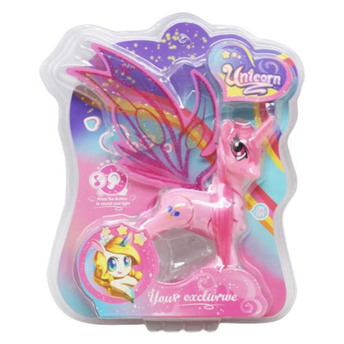 Мила конячка-поні буде чудовим подарунком. У конячки довга, шовковиста грива і хвіст, гарні прозорі крила, а також ріг, як у єдинорога. У іграшки є світлові та звукові ефекти (активуються при натисканні кнопки на грудях). Розмір конячки (без крил) – 15х12х4 см. Виконана з міцного пластику. Для дітей від 3-х років.