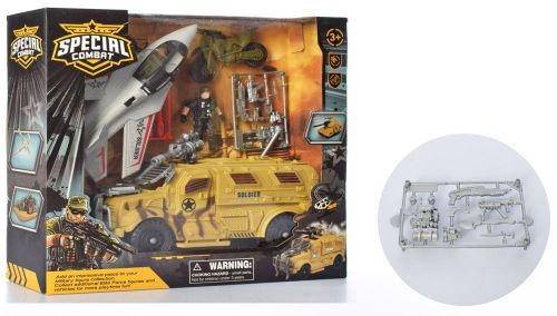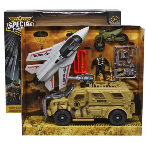 Комплектація: Фігурка солдата, собака, машина-позашляховик, літак, мотоцикл, декорації.