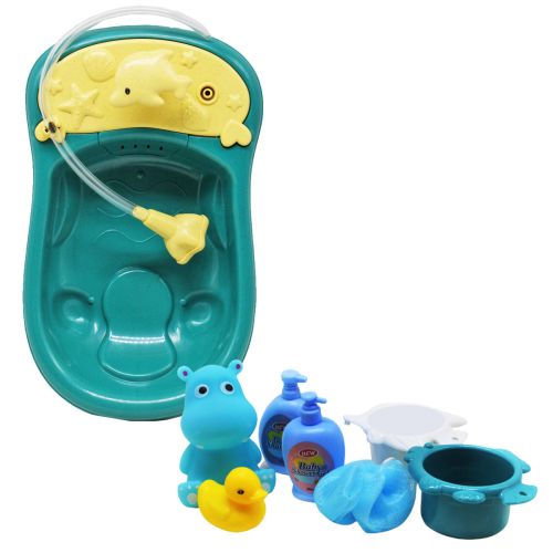 Яскравий набір для гри у ванній кімнаті. У комплекті є гумовий бегемотик-пищалка, мочалка, 2 горнтка з отворами (сито для води), пластикова качка та пляшка гелю для душу. Ванна оснащена душем – у спеціальний відсік ванни можна налити води, і при натисканні на кнопку у вигляді дельфіна вода надходитиме в душ через прозору трубку. Розмір ванни – 18х27х4 см.
