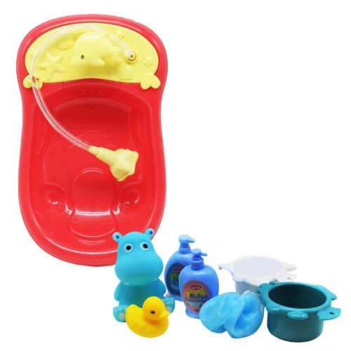 Яскравий набір для гри у ванній кімнаті. У комплекті є гумовий бегемотик-пищалка, мочалка, 2 горнтка з отворами (сито для води), пластикова качка та пляшка гелю для душу. Ванна оснащена душем – у спеціальний відсік ванни можна налити води, і при натисканні на кнопку у вигляді дельфіна вода надходитиме в душ через прозору трубку. Розмір ванни – 18х27х4 см.
