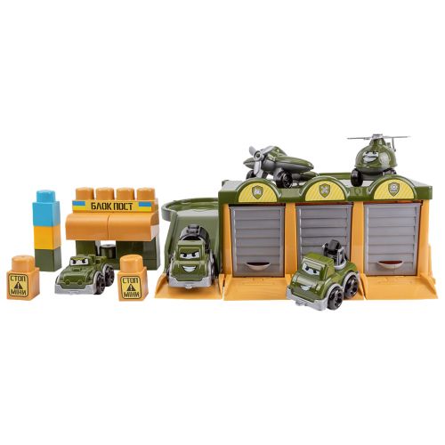 Великий ігровий набір, з яким можна зібрати велику військову базу з блокпостом, трьома машинками, літаком та гелікоптером. Дитина зможе зібрати великий гараж для машинок та посадковим майдачиком. Набір виконаний із міцного пластику. Для дітей віком від 3-х років.