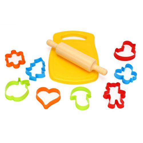 Цікавий ігровий набір для юних кулінарів. У комплекті: дощечка (19 х 13,5 см), скалка 19 см, і 8 формочок для випічки різних форм і кольорів. Набір виготовлений з якісного і міцного пластику.