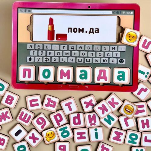 Ігровий набір “Збери слово по картинці”. У комплекті є основа-планшет, 74 плашки з буквами, 2 плашки -знаки і 84 картки з картинками різної тематики. З букв збирається слово, яке випадає в ході гри на зображенні. Відмінно тренує памʼять, увагу, посидючість.
