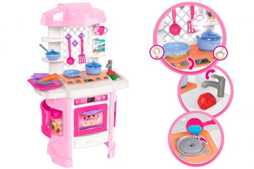 Ігровий набір “Кухня” буде цікавим подарунком дитині. Являє собою конструкцію зі столиком, плитою, мийкою, духовкою і поличками для посуду. Так само, в наборі є: продукти (6 шт.), Доточка (1 шт.), Каструлька (1 шт.), Сковорідка (1 шт.), Чашечка з блюдцем (2 шт.), Тарілочка (2 шт.) , кухонні (4 шт.), і столові (6 шт.) прилади. Є світлові і звукові ефекти (світяться елементи на плиті і духовці, шум, звук кипіння). Коли в каструльці що то готується – йде пар (холодний і повністю безпечний для дитини). Розмір конструкції в зібраному вигляді – 51х81х30 см. Виконана з якісного пластику. Для дітей від 3-х років.