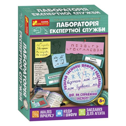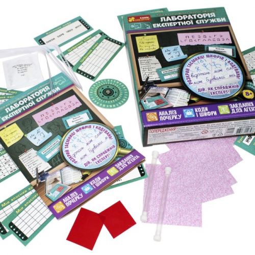 Комплектація: Червона плівка, клей ПВА, папір для шифрування, шифрувальне колесо, кольорові шифрувальні аркуші, капсули для шифрування, картка “Квадрат Полібія”, картка “Шифрування карт”, картка “Цифровий ключ”, картка “Піг-пен”, картка “Мій власний код”, посвідчення експерта, картки із завданнями, довідник експерта з графології та шифрування.