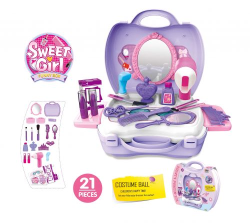 Комплектація: Валіза, столик з поличками, фен, душ, 2 помадки, коробочка, гребінець, люстерко, 3 пензлика для макіяжу, гребінь, 2 флакончика парфумів, заколочка