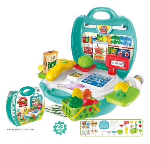 Ігровий набір “Супермаркет” складається з пластикового валізки з ручкою, який перетворюється в касу з декоративними калькулятором, вагами і сканером. З боків каси знаходяться полички, а на кришці є гачки і поличка. У комплекті: 2 коробочки з продуктами, гроші (купюри), кукурудза, морква, лимон, брокколі, перець, помідор, капуста і продуктовий кошик.