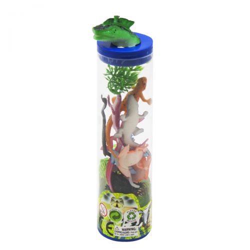 Ігровий набір тварин стане прекрасним подарунком для малюка від трьох років. Всередині є, приблизно, 10 видів різних фігурок (тварини / риби / земноводні / комахи / динозаври), а так само, інші об’єкти (кущі, дерева, рослини і т.д.). Розмір однієї фігурки – 4-6 см. Виконано з якісних і безпечних матеріалів.