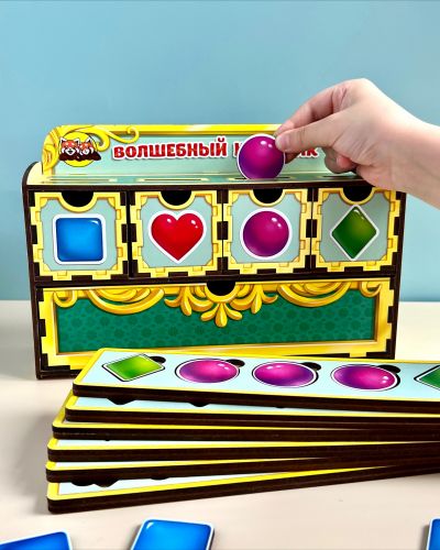Ігровий набір “Чарівна скринька” буде прекрасним подарунком. Являє собою комод з 4 ящиками для сортування вкладишів і 1 ящиком, де знаходяться рамки для вкладишів. У комплекті 5 рамок і 25 вкладишів.