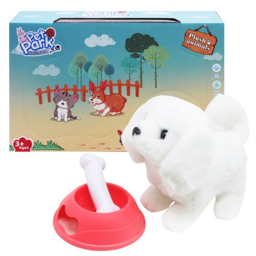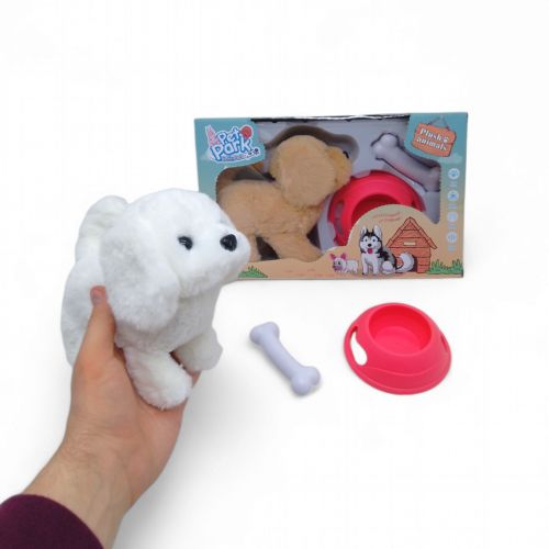 Інтерактивна іграшка “Собачка”. Іграшка працює від 2-х батарейок АА (немає в комплекті). Ходить у різних напрямках і гавкає. У наборі є кісточка та миска для собачки. Розмір іграшки 17х11х16 см.