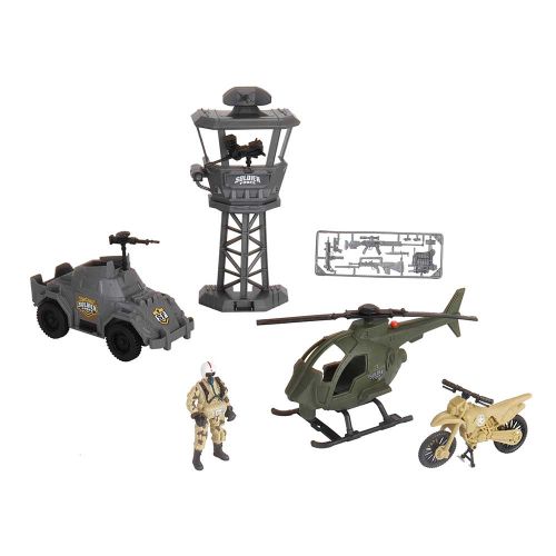 Ігровий набір Солдати DEFENSE OUTPOST Основні компоненти: Іграшка Вертоліт з світловим та звуковим ефектом – 1шт. (Батарейки типу AG13 / LR44 – 3 шт. В комплекті) Іграшка сторожова вежа – 1 шт. Іграшка Машинка – 1шт. Іграшка вмотоцикл – 1шт. Фігурка (Солдатик) – 1 шт. аксесуари функції: Світловий і звуковий ефект вертольота
