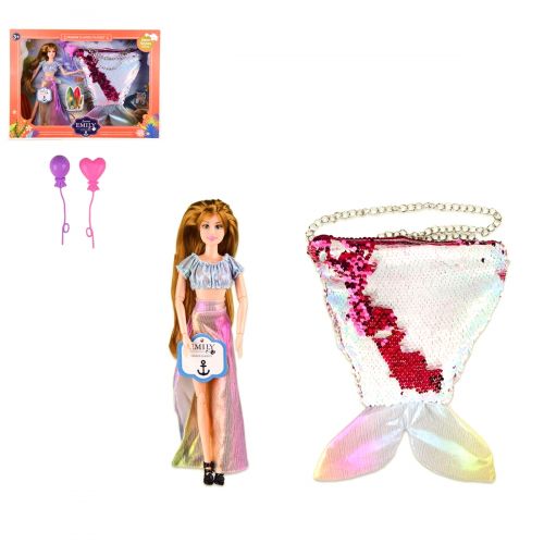 Ігровий набір “Emily” з лялькою і дитячої сумочкою. У ляльки рухливі руки і ноги (з шарнірами). Сумочка ф формі хвоста русалки. Прикрашена блискучими паєтками. Висота ляльки – 30 см., Розмір сумочки – 26х20 см. Виконаний набір з якісних і безпечних матеріалів. Для дітей від 3-х років.
