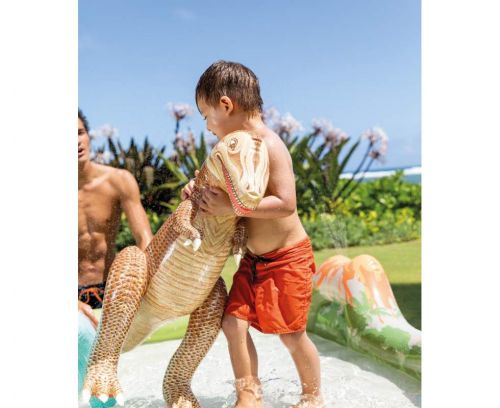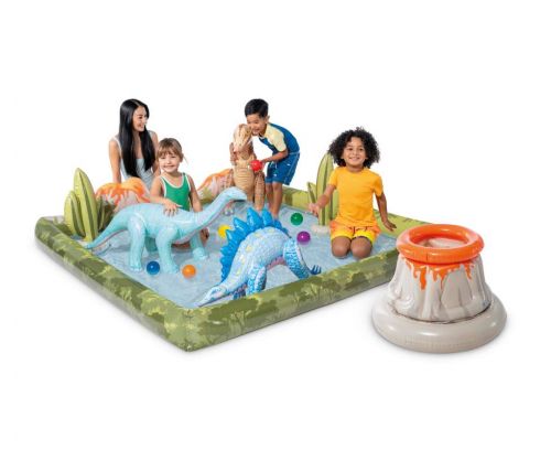 Надувний ігровий центр “Юрський період”. Розмір конструкції: довжина – 201 см; ширина – 201 см; висота – 36 см; висота бортика – 11 см. Виготовлено з високоякісного вінілу (товщина матеріалу – 0,33 мм). Дно не надувне. Обʼєм води – 410 л. У комплекті надувні іграшки: 3 різних динозаври; 2 кактуси; вулкан; а також мʼячики. Рекомендовано для дітей старше 2-х років.